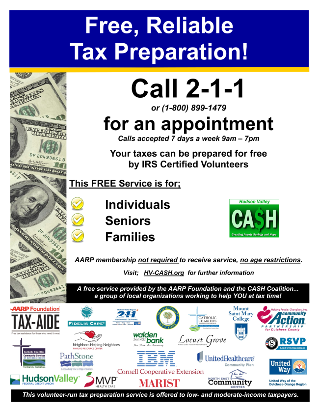 If you are one of the many Hudson Valley residents who need help with your tax return, FREE tax preparation once again is available from AARP Foundation Tax-Aide’s IRS trained and certified volunteers through the Hudson Valley CA$H Coalition. Last year, 7,797 residents of Dutchess and Orange Counties received help preparing and filing their taxes. This year, the coalition hopes to help even more people receive the refunds they deserve.